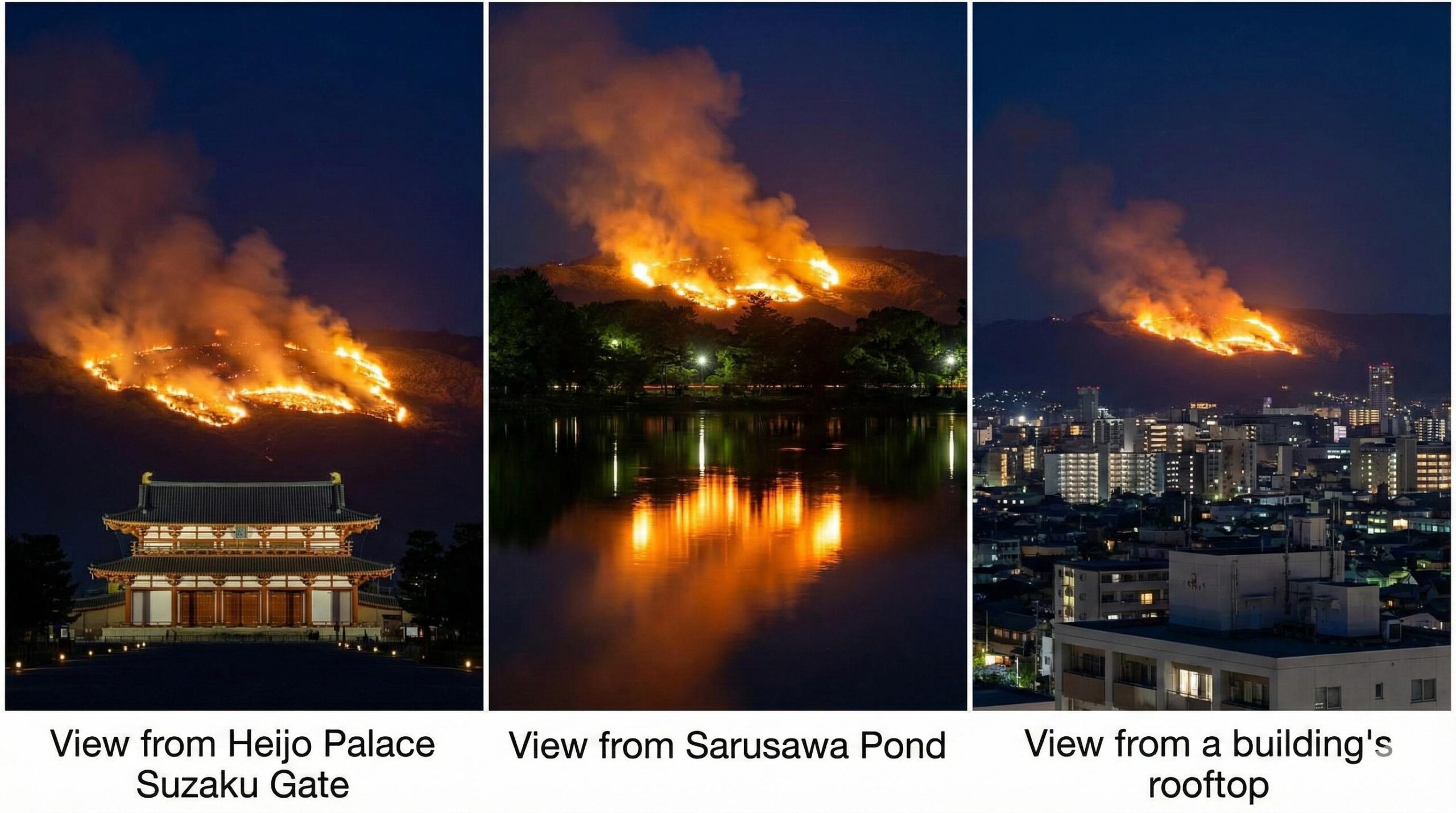結論はシンプルで、落ち着いて全体を見たいなら平城宮跡、逆さ火を狙うなら猿沢池、特別感なら県庁屋上です。