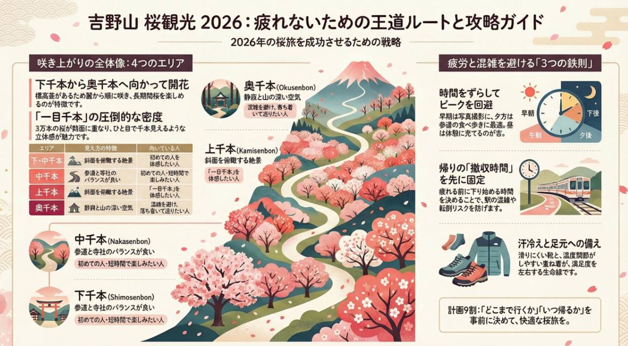 「どこまで行くか」と「いつ帰るか」を最初に決めるだけで、吉野の桜は落ち着いて味わえます。